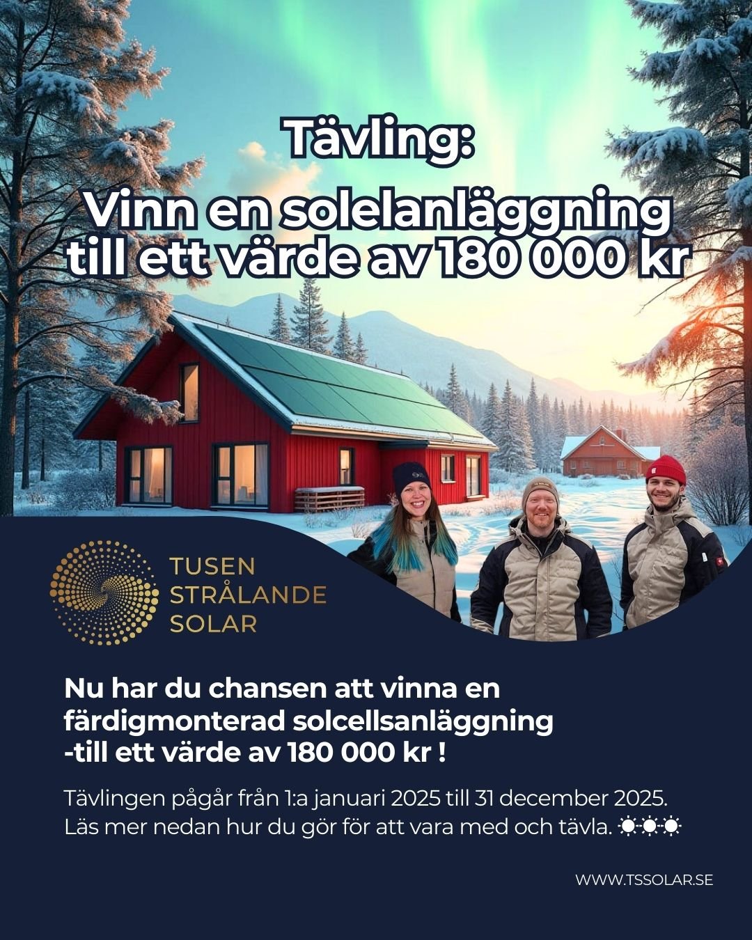 Allmänna villkor: För att erhålla gåvan måste den som du tipsar köpa en solcellsanläggning eller batterilösning. Kampanjen sträcker sig fr.o.m 7 april – 31 oktober 2025. Kunden ska ha tagit kontakt med oss efter 7 april då kampanjen startade. Tänk på att ev.skatt betalas/deklareras av mottagaren för ersättning – här i form av produkt eller presentkort.